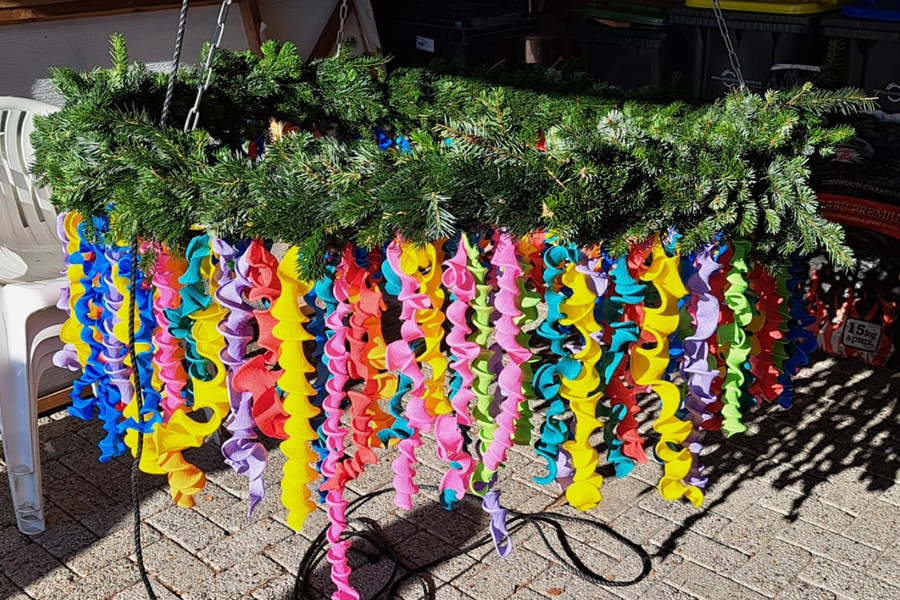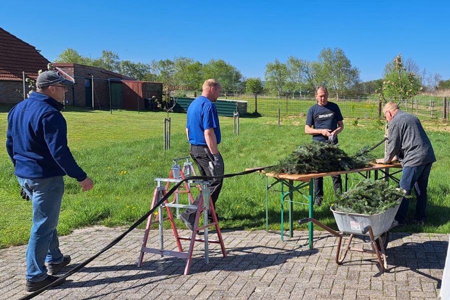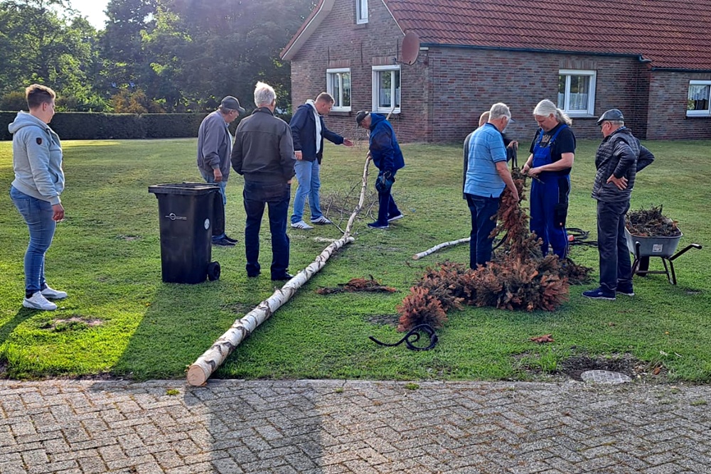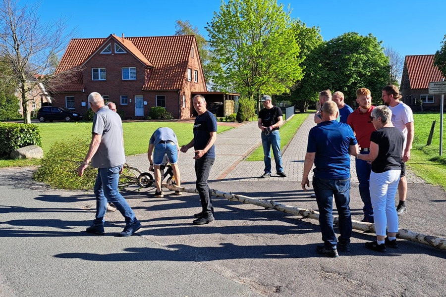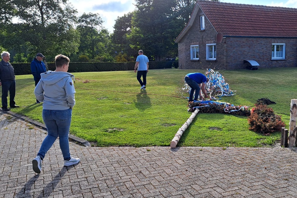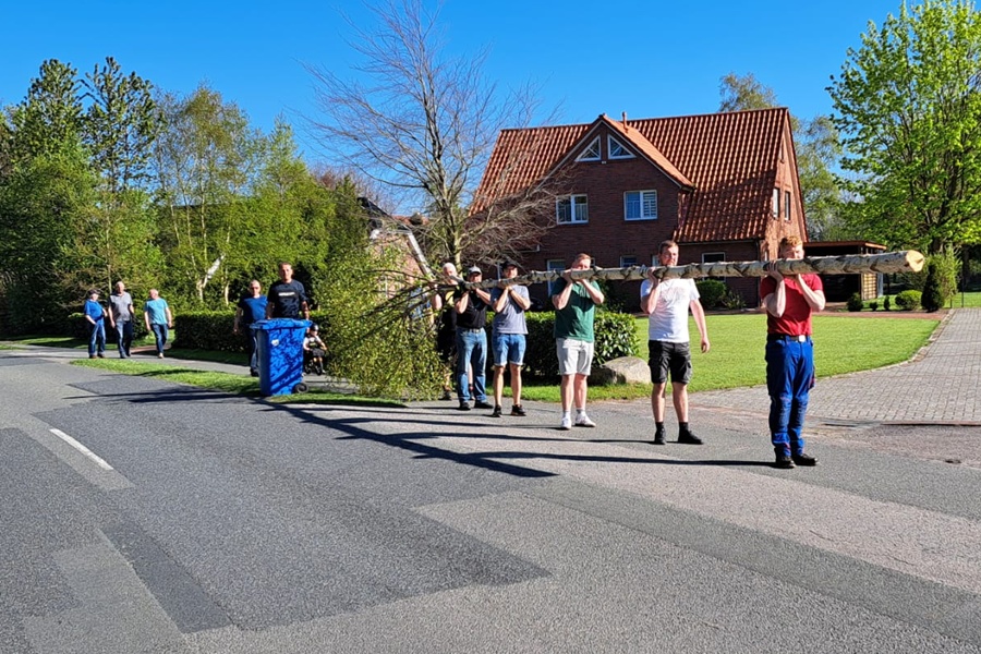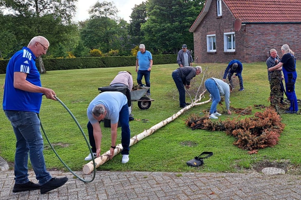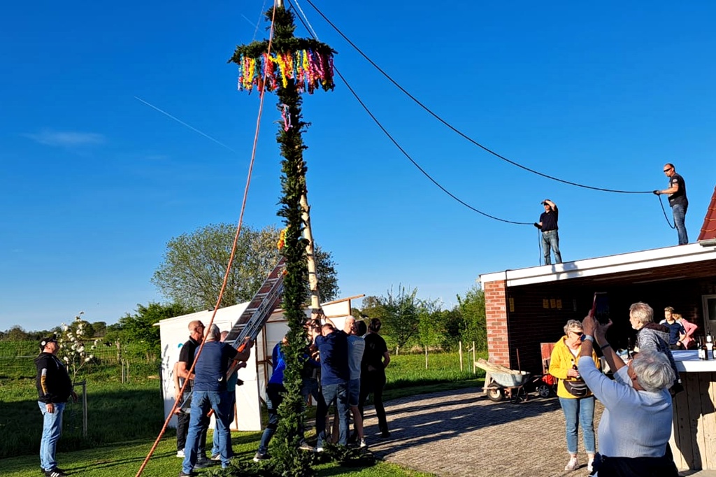 Mit vereinten Kräften hoben einige Vereinsmitglieder den prachtvollen Baum in die Höhe. Schließlich wurde der Baum in seiner Position verankert, und die bunten Bänder wehen sanft im Wind.
