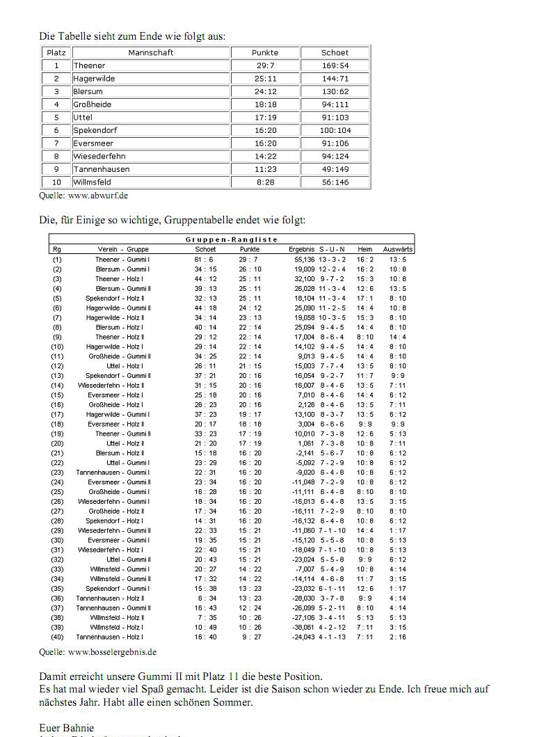 Spieltag 14 – Heimkampf unter traurigen Voraussetzungen Der Tag begann sehr traurig mit einer Schweigeminute für einen kürzlich verstorbenen Werfer aus Tannenhausen. Anschließend ging es mit gedrückter Stimmung in den ausgeglichenen Wettkampf. In der Bezirksklasse ist seit Jahren ein sehr ausgeglichenes Teilnehmerfeld zu beobachten. Der Ausgang eines jeden Wettkampfes hängt von der aktuellen Besetzung und der Tagesform ab. Dies ist auch in diesem Jahr wieder so. Und so war auch an diesem Tag jeder Meter wichtig. Zur Wende hatten wir leichte Vorteile in Holz II und Gummi II. Diese verschoben sich auf dem Rückweg jedoch deutlich. Gummi II konnte den Vorteil zwischenzeitlich auf gut 6 Wurf ausbauen. Tannenhausen egalisierte dies jedoch auf den letzten Kilometer nahezu vollständig. Anders in Holz I. Wurde vor "Kurve Kleen" noch ein Wurf versenkt, gaben sie ab dort richtig Gas und konnten dank einer herausragenden Leistung gewinnen. Im Detail führte dies zu folgendne Gruppenergebnissen: Holz I gewann mit genau sechs Wurf. Holz II verlor mit einem Wurf und 50 Metern. Gummi I verlor mit 104 Metern. Gummi II gewann mit 145 Metern. Insgesamt gewannen wir erneut mit gut 4 Wurf. Damit haben wir 16 Punkte erreicht. Das Mittelfeld ist damit gesichert. Und ein klitzekleines schielendes Auge nach oben können wir nicht verbergen. Es war windstill mit sehr tief hängenden Wolken bei ca. 5°. Zwischenzeitlich nieselte es ein wenig. Dies war jedoch nur schwer von der "hohen Luftfeuchtigkeit" zu unterscheiden.