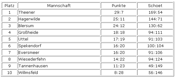 Somit gewannen wir insgesamt mit 2 Wurf und 13 Metern. Ein knapper Sieg der uns in die obere Hälfte der Tabelle katapultiert. Somit können wir eine positive Hinrunde bilanzieren: Ein Auswärtssieg und 4 Heimsiege. "Alles Gut" sage ich da immer. Im Nachhinein kann man sich noch über die doofe Auswärtsniederlage in Spekendorf ärgern. Die möglichen Punkte hätten uns an die Spitze gebracht. Was solls.