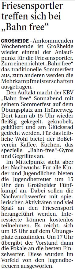 Großes Friesensport-Wochenende in Großheide Sommerfest von „Bahn free“ und Mehrkampfmeisterschaften Am kommenden Wochenende ist Großheide wieder einmal das Mekka der Friesensportler. Den Aufschlag macht „Bahn free“ Großheide am Samstag mit seinem Sommerfest auf dem Übungsplatz am Thünerweg. Dort kann ab 15 Uhr wieder fleißig gekegelt, geknobelt, geklütert und am Glücksrad gedreht werden. Für das leibliche Wohl bietet der Bosselverein Kaffee, Kuchen, das spezielle „Bahn-free“-Gyros, Gegrilltes und kalte Getränke an. Im Mittelpunkt steht aber der Nachwuchs: Für alle Kinder und Jugendlichen bieten die Jugendbetreuer um 15:00 Uhr den Großheider Fünfkampf an. Dabei sollen die Nachwuchswerfer mit spielerischen Aktivitäten und viel Spaß an den Friesensport herangeführt werden. Interessierte können kostenlos teilnehmen. Es reicht, sich um 15 Uhr auf dem Übungsplatz einzufinden. Um 17 Uhr übergibt der Vorstand dann die Pokale an die besten Einzelwerfer jeder Altersklasse. Diese wurden im Vorfeld von den Jugendbetreuern ausgeworfen. |