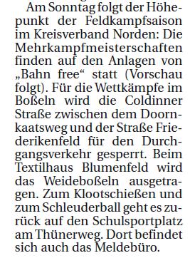 Am Sonntag folgt der Höhepunkt der Feldkampfsaison im Kreisverband Norden: Die Mehrkampfmeisterschaften finden auf den Anlagen von „Bahn free“ statt. Für die Wettkämpfe im Bosseln wird dazu die Coldinner Straße zwischen dem Doornkaatsweg und der Straße Friederikenfeld für den Durchgangsverkehr gesperrt. Beim Textilhaus Blumenfeld wird das Weidebosseln ausgetragen. Zum Klootschießen und zum Schleuderball geht es zurück auf den Schulsportplatz am Thünerweg. Dort befindet sich auch das Meldebüro. Alle interessierten Zuschauer sind herzlich willkommen, den besten friesischen Mehrkämpfern im Kreisverband bei ihren Höchstleistungen zuzusehen. |