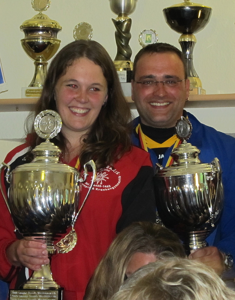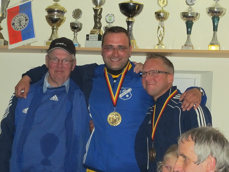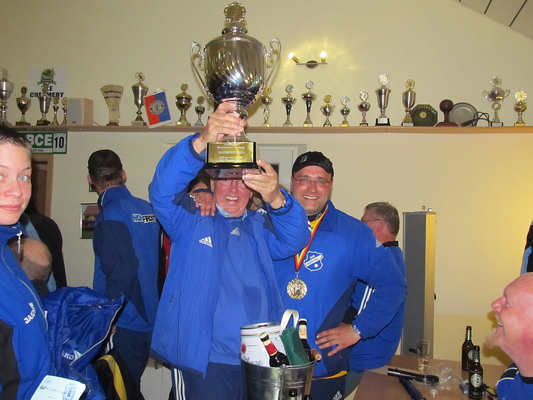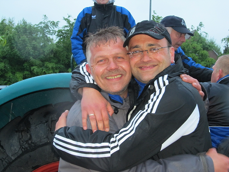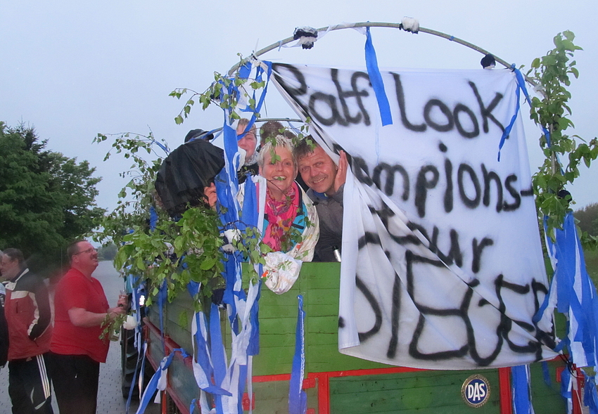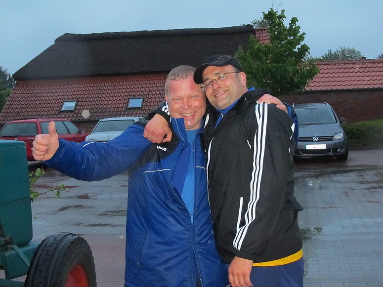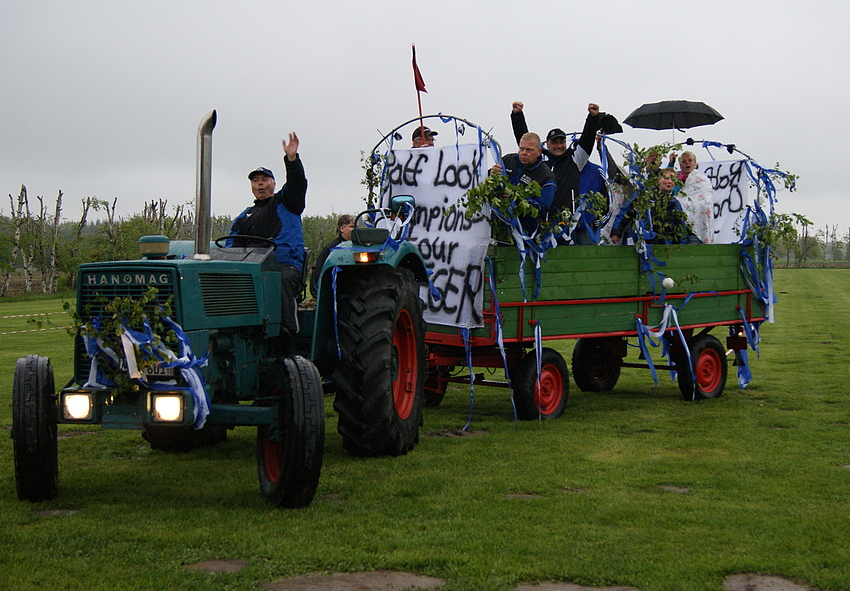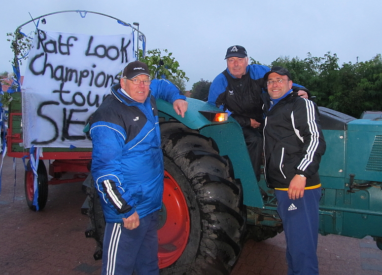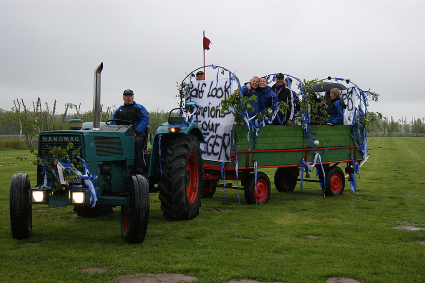Trotz des miesen Wetters waren alle guter Dinge und fieberten dem großen Finale entgegen. Die fast einstündige Wartezeit bis zum Start verbrachte Ralf mit Jens. Jens hielt Ralf geduldig den Schirm und bot Windschutz, damit Ralf nicht schon vor seinem Start pitschenass wurde.Der Wettkampf war perfekt. Ralf zeigte sein ganzes Können und krönte seinen von vielen schon vorher erwarteten Gesamtsieg mit der Tagesbestweite. Während einer tollen Siegerehrung wurde auch mal ganz deutlich die Wichtigkeit des Betreuers und des Schiris betont. Ralf hat das große Glück, sich um die Besetzung dieser Posten NIE kümmern zu müssen. Ein Anruf bei Silke und Meinhard, um die Abfahrtszeit abzusprechen, reicht und alles läuft perfekt. Team Ralf hat eben einen super Zusammenhalt und war über die ganze CT-Saison immer geschlossen am Start.Nach der Siegerehrung wartete draußen Gerhard Büscher mit seinem Trecker und einem prima geschmückten Anhänger. Nach der feucht-fröhlichen Fahrt ging dann jeder seinen Weg, um die zweite Halbzeit des Championsleague-Finales zu verfolgen. Die siegreichen Bayern konnte man dann Montag zusammen mit Ralf auf der Titelseite des Kuriers sehen! |