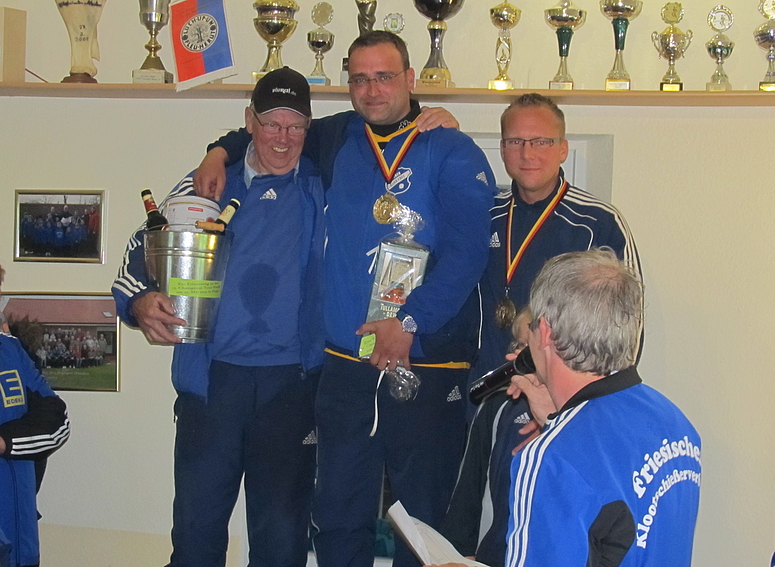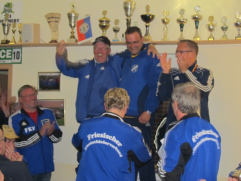 13. April 2013: Zetel (Eisen, 1388 Meter, 6. Platz, 7 Punkte) Die Straße des High-Light-Cups. Nach einem eher mäßigen Start, bewahrheitete sich, wie schon so oft, Meinhards Devise: Man muss zehn Wurf machen und dann sehen, was dabei raus kommt. Auf gar keinen Fall mittendrin den Kopf hängen lassen. Und so wurden wieder Punkte eingefahren.Weil der sehr redselige Rainer Berends an diesem Tag andere Aufgaben zu bewältigen hatte, gab es von seinem Vorstandskollegen eine sehr kurzgefasste Siegerehrung ohne Fleu herut, die uns wohl noch lange in Erinnerung bleiben wird. |