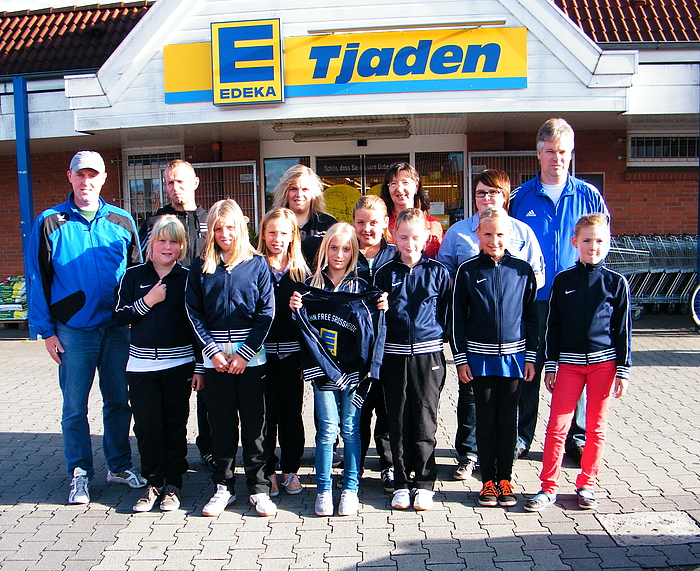 Durch einen Gewinn bei EDEKA Tjaden, hatten wir die Möglichkeit unsere weibl. Jugend D mit von EDEKA gesponserten Jacken auszustatten. Diese wurden am 13.08.2013 von Frau Tjaden an unsere Mädchen übergeben. Frau Tjaden freute sich über unsere Werferinnen und deren Betreuer. Bei der Übergabe war auch unser 1. Vorsitzender Uwe Schüler anwesend. |